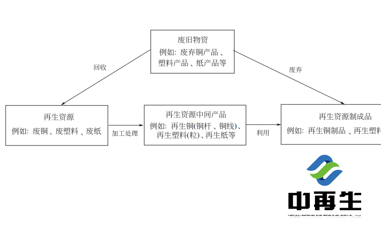 再生資源是指來源于社會生產和生活消費過程的各類廢棄物,經過回收、加工和利用等環節,可以重新獲得使用價值的物質。此外,對符合國家環??刂茦藴实倪M口可用作原料的固體廢物也是中國再生資源的一個重要來源。需要注意的是,再生資源與再生資源產品的概念有區別。例如再生銅、再生鋁、再生塑料等概念是指廢舊銅、鋁和塑料經過回收、分揀、熔煉、拉絲造粒等環節加工而成的中間再生資源產品,為制造企業深加工得到再生資源的制成品提供原料,如圖所示: