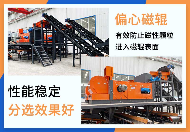 偏心渦電流分選機采用一體化的設計理念,將振動給料機、磁輥、磁滾筒、輸送皮帶機、渦電流分選主機集成于一體,可以減少設備總體積。設備前端,通過磁選原理,去除物料中夾雜的鐵質;設備后端,通過渦電流原理,將物料中的銅鋁等有色金屬雜質通過作用力彈射出來,最終達到分離鐵質,有色金屬,和其它物料的效果。